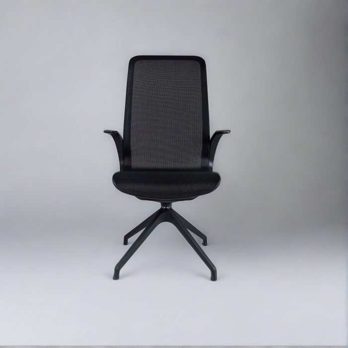 Executive chair with high backrest, black nylon structure, open black armrests, swivel plate, black nylon 4 legs base.
