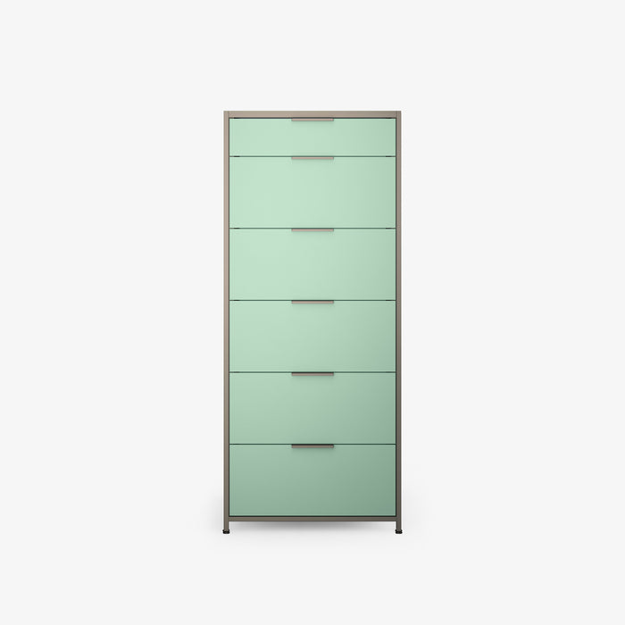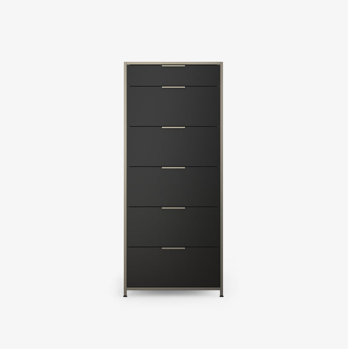 The 4-drawer chest is composed of 3 identical drawers topped with a narrower upper drawer. The 6-drawer chest is composed of 5 identical drawers topped with a nattower upper drawer.