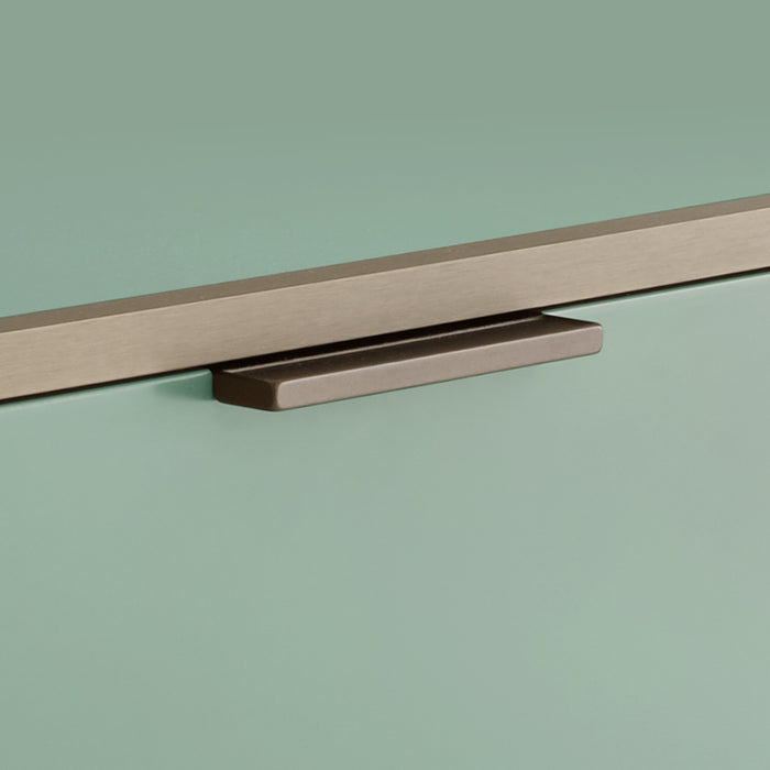 Handles are in injected zamak, lacquered bronze to co-ordinate with the uprights. Hinges are black. The feet H 30 mm continue the line of the uprights and incorporate a black jack.