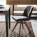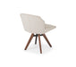The swivel chairs in the Tyler family are characterised by the sharp contrast between the enveloping backrest and the legs in natural or painted wood, which cross to form a sculptured pyramid with a strong aesthetic impact.