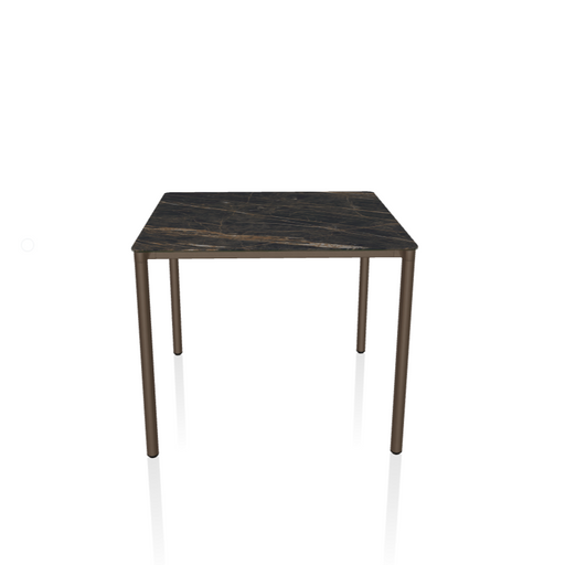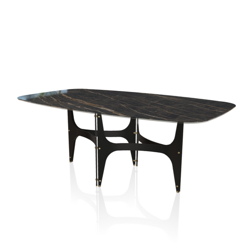 Fixed table, lacquered metal frame and decorative details. Top in Veneer wood with solid edge, Solid wood and SuperMarble.