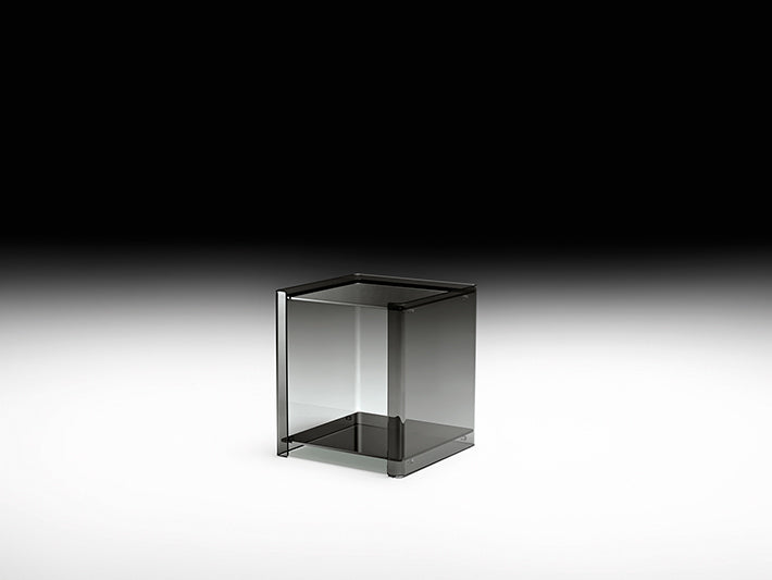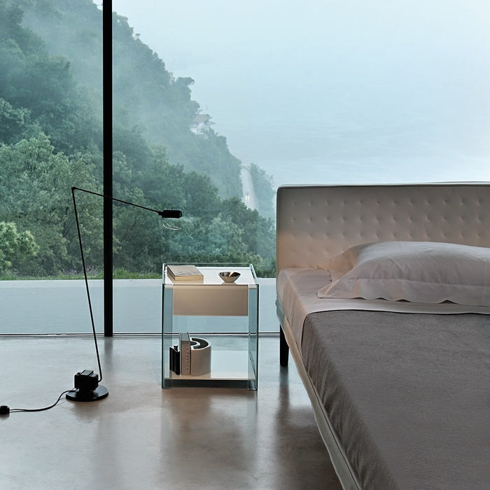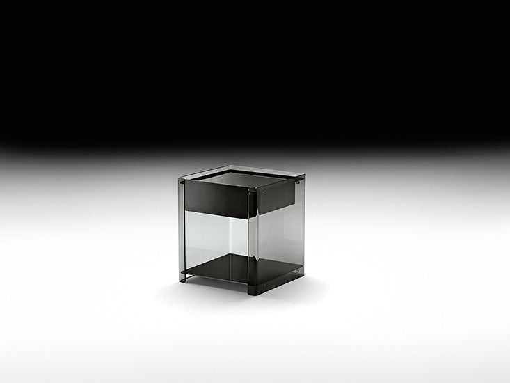 Bedside table in curved transparent or smoked glass, 8 mm-thick. Accessories: 8 mm-thick glass shelf in the following finishing options: transparent glass, smoked glass, black back-painted glass, extralight white back-painted glass wooden drawer black or white lacquered, with glass front back-painted respectively black or white. Glass shelves support. The bedside table can be fitted with 3 shelves or 2 shelves and one drawer.
