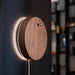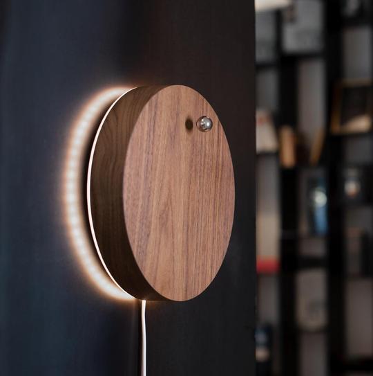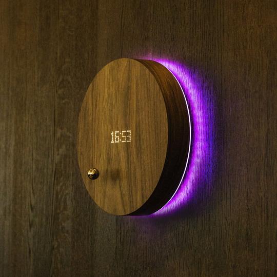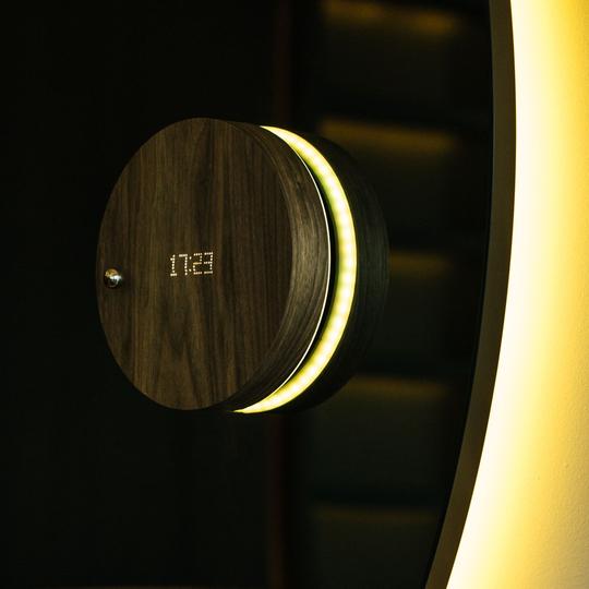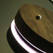 The base contains a backlit display that illuminates through the wooden surface, giving it a seamless look and finish.