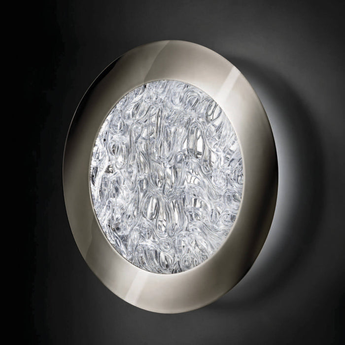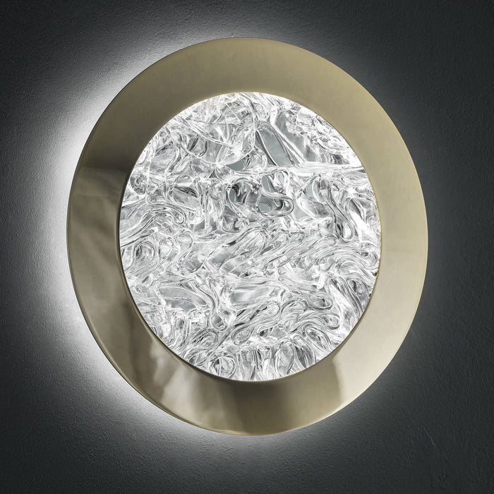 Wall and ceiling lamp with handmade cast and shaped artistic glass ribbon décor. Frame and metal structure in iron grey, light gold or chrome finish. Modern Catalogue Incanto.