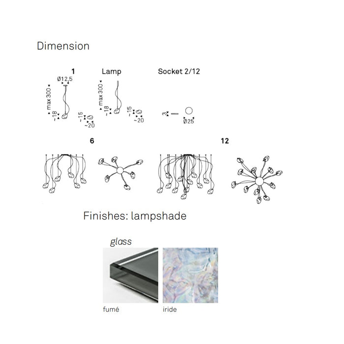 This family of modern chandeliers consists of two models: CATTELAN Cloud and CATTELAN Cloudine. Just like their namesake, these designer ceiling lamps appear to float in the air lightly. The blown glass lampshade is available in two shades: Iride, with reflections of several iridescent colours, or Fumè, a darker and more welcoming shade. Cloud and Cloudine glass designer lamps have different lampshade sizes, the first being smaller than the latter. Both models can create a composition from 2 to 12 lampshades; alternatively, you can hang a single lamp to the ceiling. Cloud is also available as a modern table lamp with a steel base which appears to blow the air inside the globe, keeping it in shape.