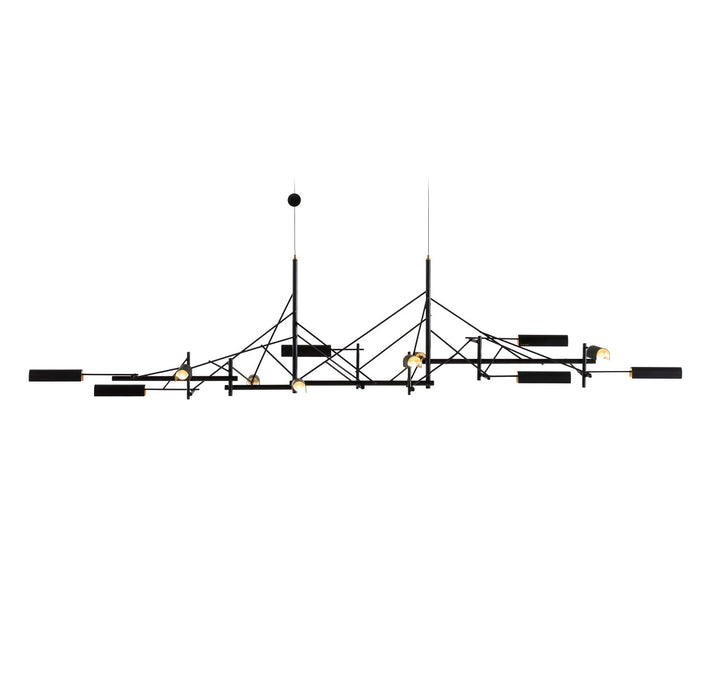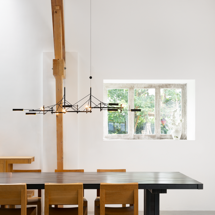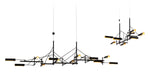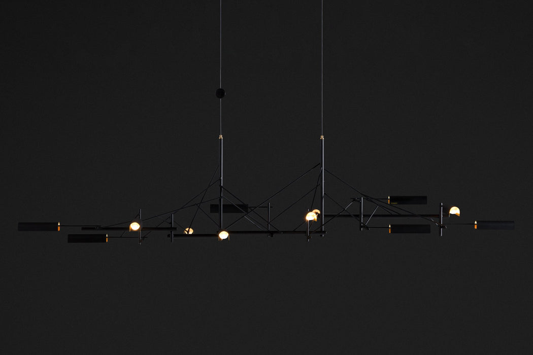 Moooi Tinkering: Tinkering, designed by Joost van Bleiswijk, captivates its spectators through a rhythmic composition that is made from black coated stainless steel and brass. This suspension lamp is available in two sizes, Tinkering 140, which feature 7 and 12 LED light sources, respectively.