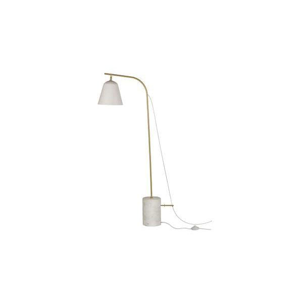 – White marble base with polished brass rod and white painted lampshade