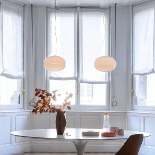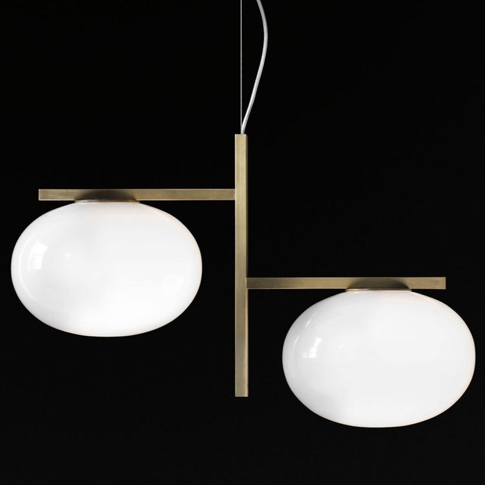 Suspension lamp giving diffused light in polished opaline blown-glass. Satin brass or anodic bronze finish structure with rectangular profile.