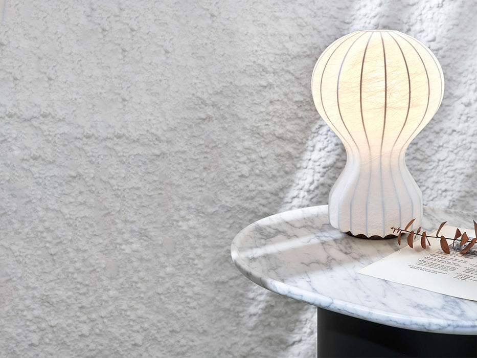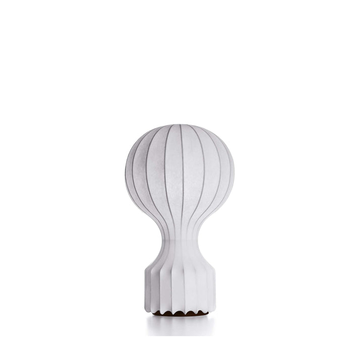 Table lamp providing diffused light. White powder coated internal steel structure sprayed with a unique "cocoon" resin to create the diffuser which is then protected by a transparent sprayed on finish. On the cable there is the electronic dimmer which allows the regulation of light brightness.