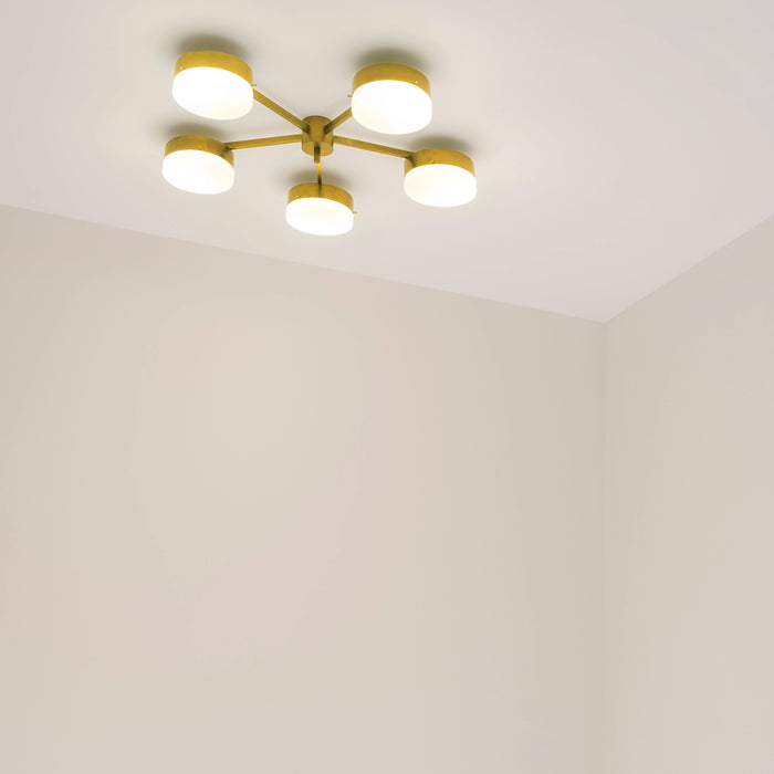 According to Design for Macha atelier's philosophy, Ethereal, one of the pieces in the Celeste collection, is also entirely handmade. The combination of minimalist shapes, captivating geometries and excellent materials creates the strong personality of this lamp. Thanks to its 5 opaline Murano glass globes supported by 5 brass arms, it stands out in the interior environment it is placed in. Ethereal can be mounted both as a hanging and a wall lamp.