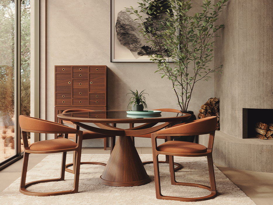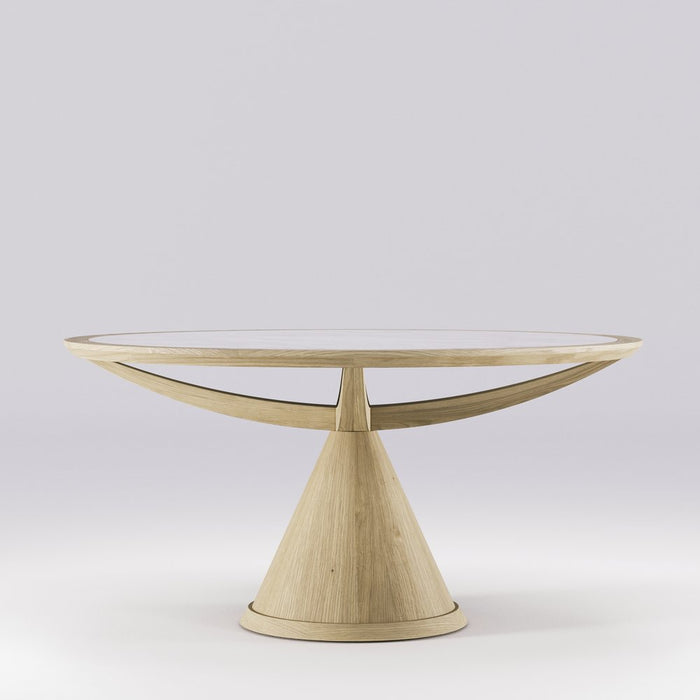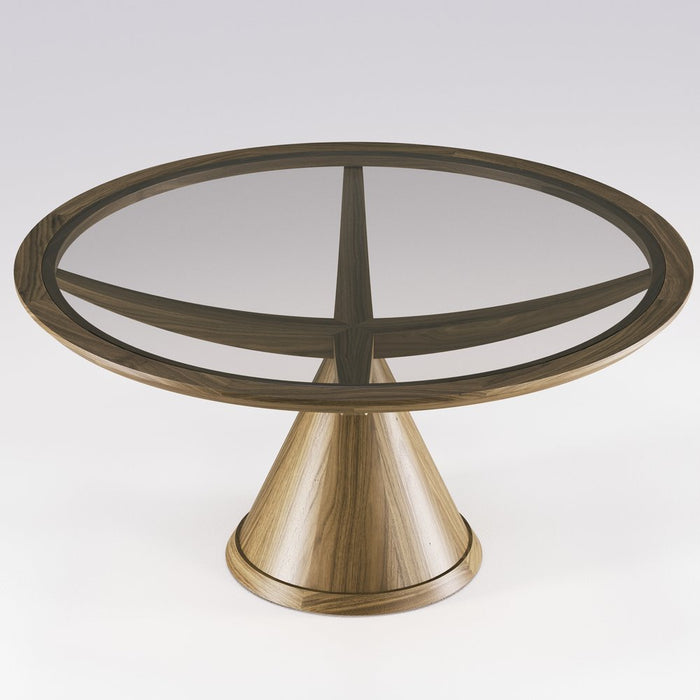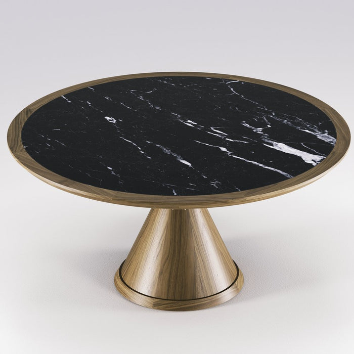 Vasco is a round table with a marble or glass top that rests with extreme delicacy on a sculptural pedestal base, that gives it harmony and creates the illusion of an object almost in a precarious balance.