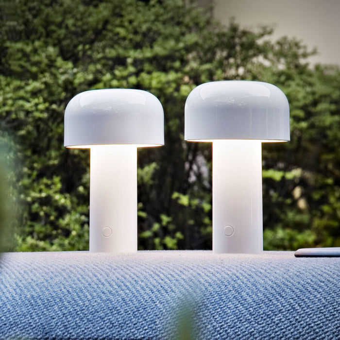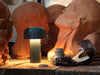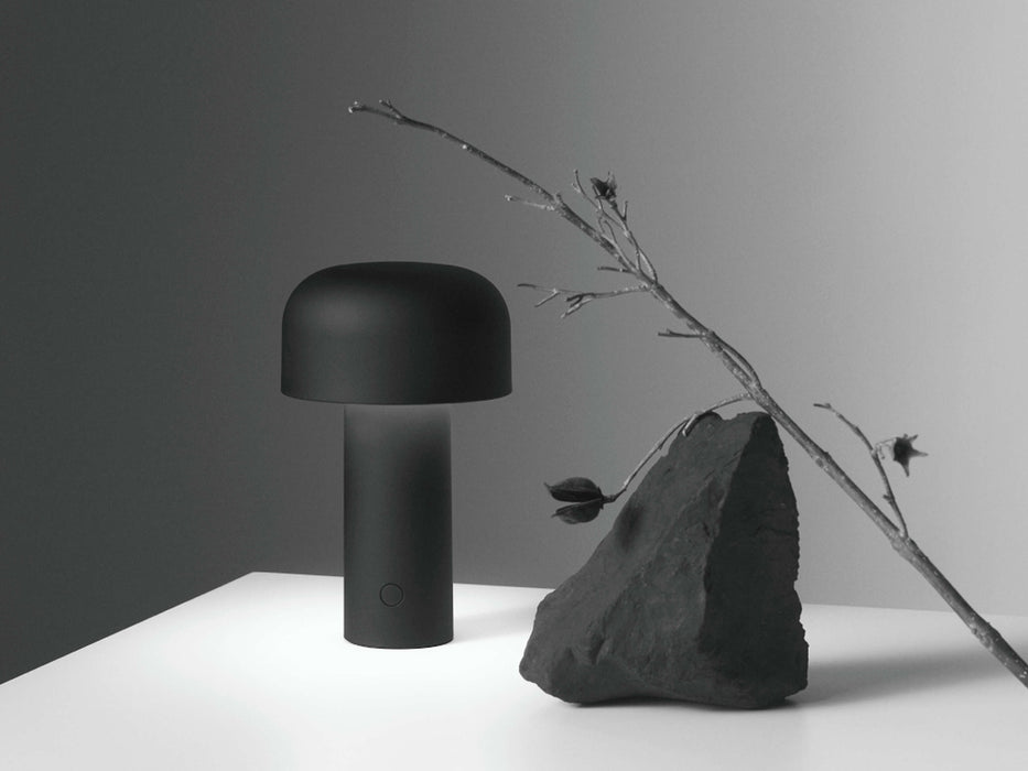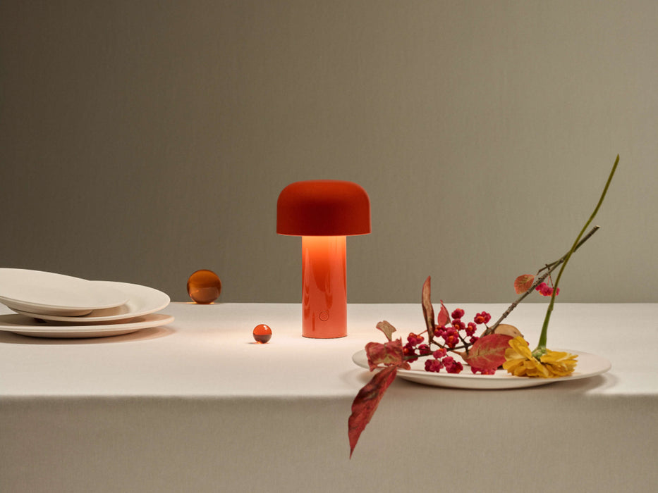 Rechargeable direct light table lighting device. Base and dome in coloured PC. Diffuser in Opaline injection moulded photo-engraved PC. 24-hours' autonomy, charging via Micro-USB-C.