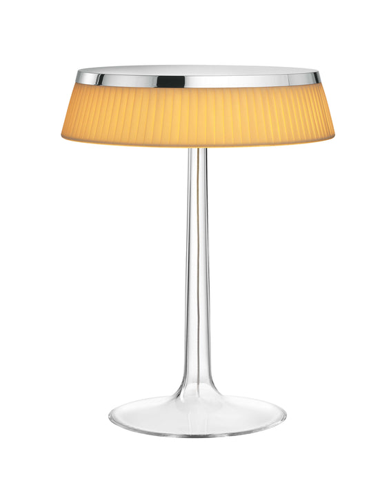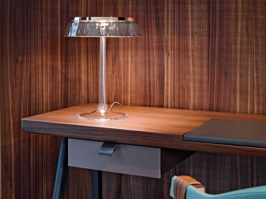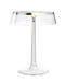 Table lamp providing diffuse light. Injection moulded PMMA clear transparent base and diffuser. Edge Lighting technology light source.