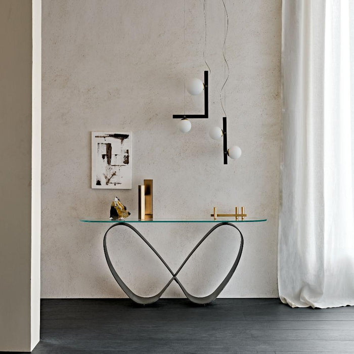 The steel base of the Butterfly design tables becomes the star of the modern dining room with a sculpture-like style and a reference to the elegance of nature. The consolle glass top is laid on the base, with its fragile appearance it creates a contrast with the bold and revolutionary combination of curves and edges. In the Butterfly Keramik version, the table is further embellished by the Marmi ceramic top, available in several exclusive shades. Finally, in the Butterfly Consolle model, the glass top takes on an unprecedented shape with rounded sides, whose proportions arise from the harmonious design of the base.