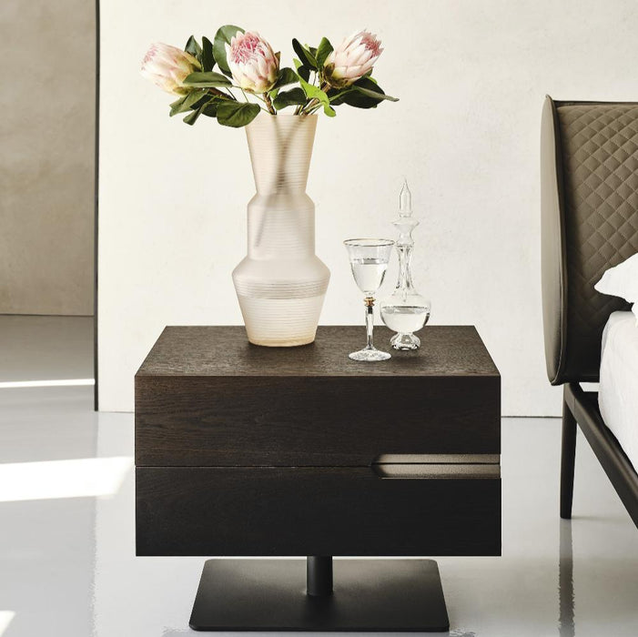 CATTELAN Ciro is a family of matching dressers and nightstands with a minimal and elegant look.Its pure lines and classic forms are enhanced by inserts in synthetic leather or soft leather, available in a wide and refined colour palette.Paolo Cattelan conceives this modern dresser with 8-drawers, frame and fronts in lacquered wood and grooves with delicate contrasting inserts. CATTELAN Ciro can be combined with a 2-drawers nightstand, available in two different sizes and heights. The taller version has a central steel leg with a wide squared base. The bedroom collection by Cattelan Italia consists of designer nightstands and modern double beds. It has been created to complete a modern bedroom with charming design pieces.