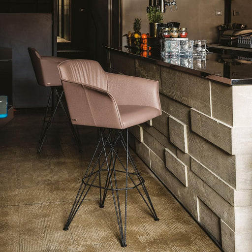 These swivel and return stools do not go unnoticed, thanks to the contrast between the industrial base and the soft upholstery, available in a wide range of colours and refined materials. Both models are made with or without armrests, the stool is available in two heights.