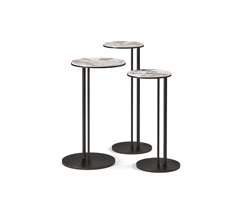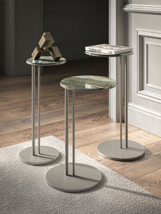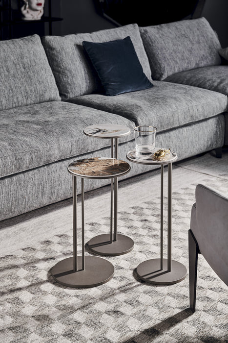Sting modern coffee tables stand out for their natural elegance and undoubted practicality. Lightweight and easy to handle, they are incredibly useful and multifunctional living room accessories. These steel side tables can be placed near sofas and armchairs, for holding devices and magazines or for serving aperitifs to your guests in the comfort of a welcoming, flexible and modern living room. The steel base consists of two narrow legs of different diameters, enriched by exquisite metallic finishes. Initially created by Paolo Cattelan to have a Marmi ceramic top, Sting then evolved into the Sting Brushed version, with a steel top brushed freehand by skilled artisans.