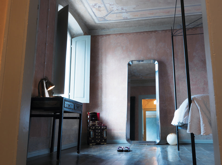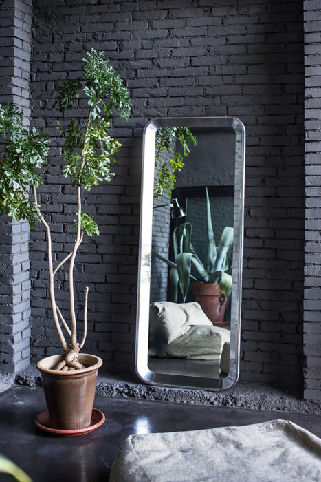 Material: Frame in extruded aluminium, polished. Joints in die-cast aluminium, polished. Mirror with protective back film. Supplied with brackets for wall hanging in zinc plated steel or resin strip for floor standing. Available in three different dimensions.