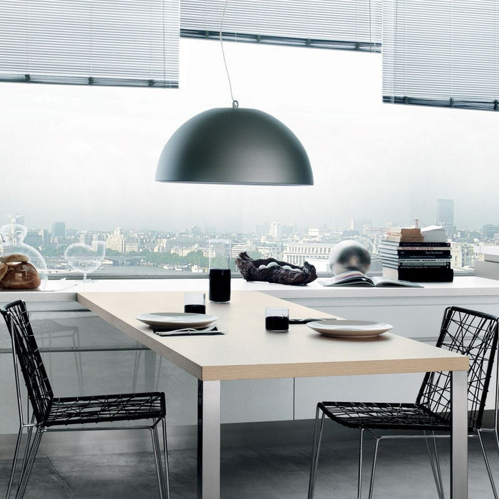 Suspension lamp with timeless design, particularly suited for direct lighting of any kind of surface. It is available in two different sizes.
