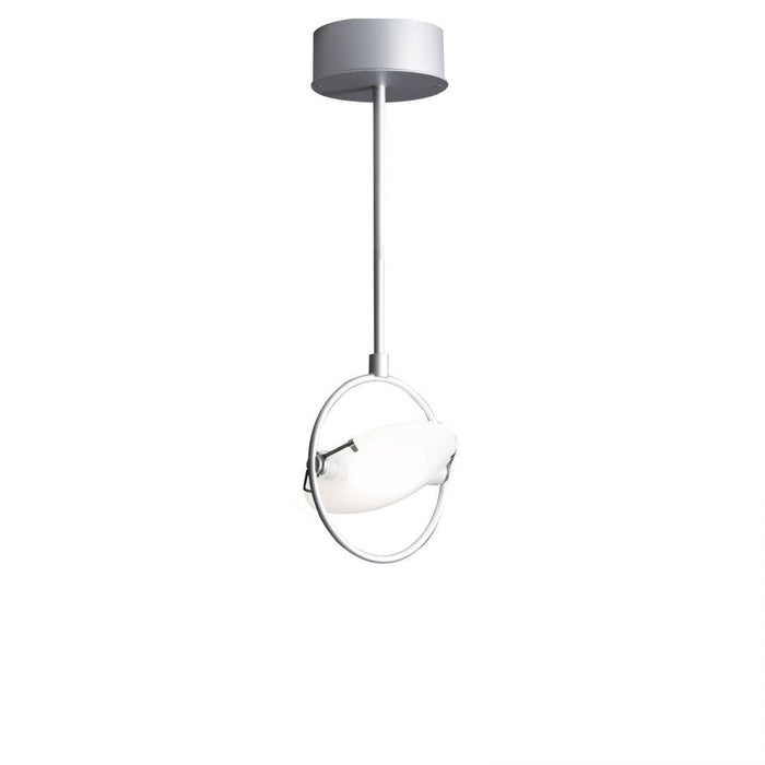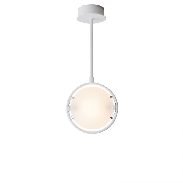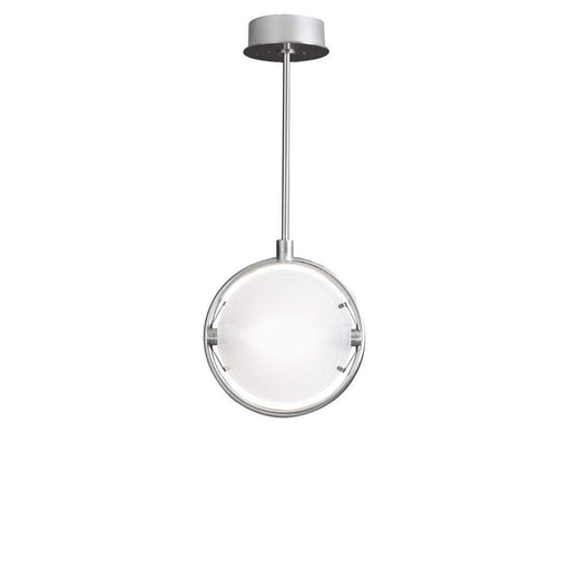 Suspension lamp with diffused and dimmable light. By installing the supplied reflector, the lamp produces direct/indirect directional light. Frame and ceiling connection made of satined nickel-plated metal. Adjustable satin glass diffuser and reflector made of anodized aluminum. Bulb not included.