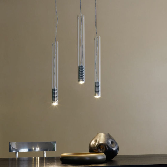 Simplicity and linearity conveyed by a suspended glass cylinder. When switched on, the light is the undisputed main player. Perfect to create a small or large composition, adjustable in height.