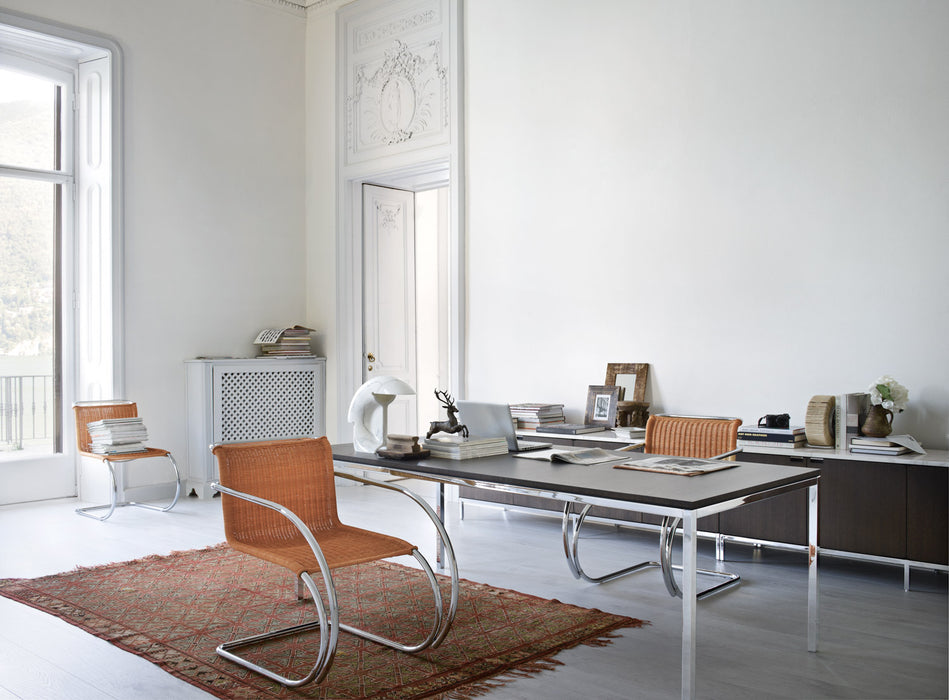 Reintroduced in 2018, the MR Chair with a rattan seat expands the Knoll MR Collection, which represents some of the earliest steel furniture designs by Mies van der Rohe. The frame material was inspired by fellow Bauhaus master Marcel Breuer, while the form is thought to be a modern derivative of 19th century iron rocking chairs.