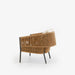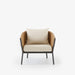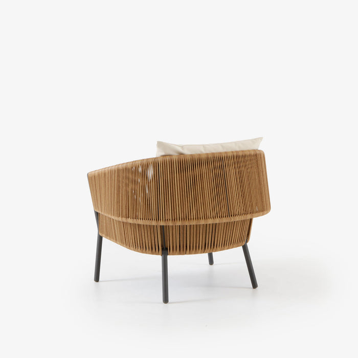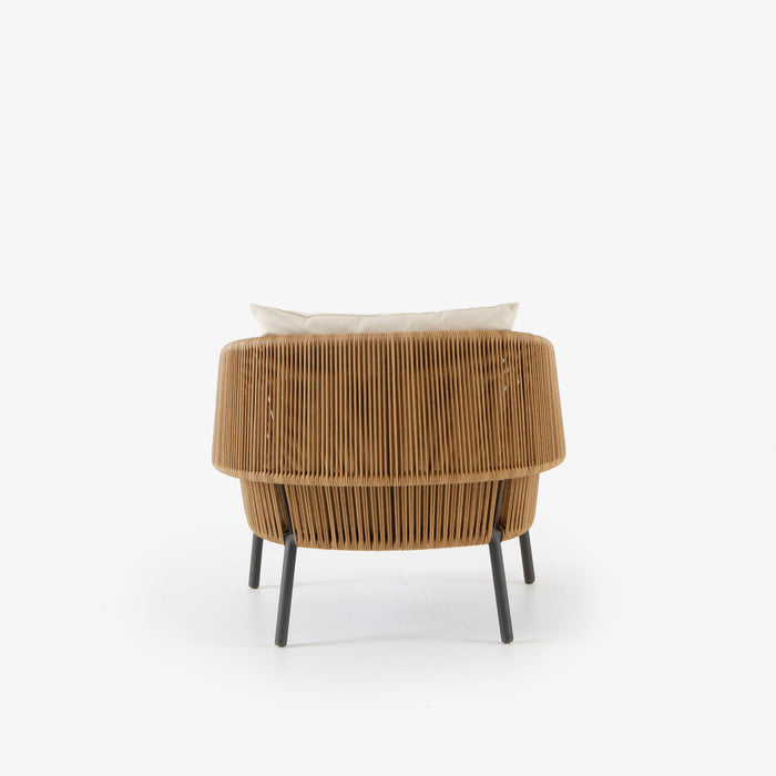 Armchair with aluminium structure finished in carbon-coloured lacquer, back in woven synthetic resin (high density polythene) and a seat pad in polyurethane foam 24 kg/m3 covered in beige-coloured polyester fabric (with polyester liner).