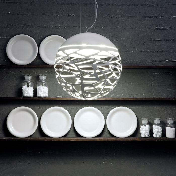 Kelly is available as a large dome-shaped Kelly Dome pendant with a diameter of 50, 60 or 100 cm or as a spherical Kelly Sphere pendant. The Kelly Cluster Sphere with three or seven spheres and is an attractive lighting solution for illuminating tables. The Kelly wall lamp also shows off the wonderful light and shadow effects of the laser cut.