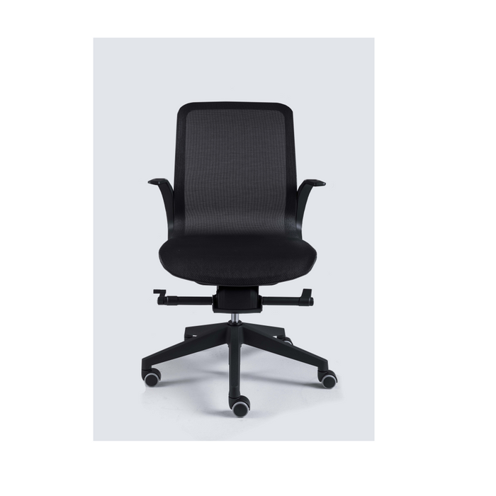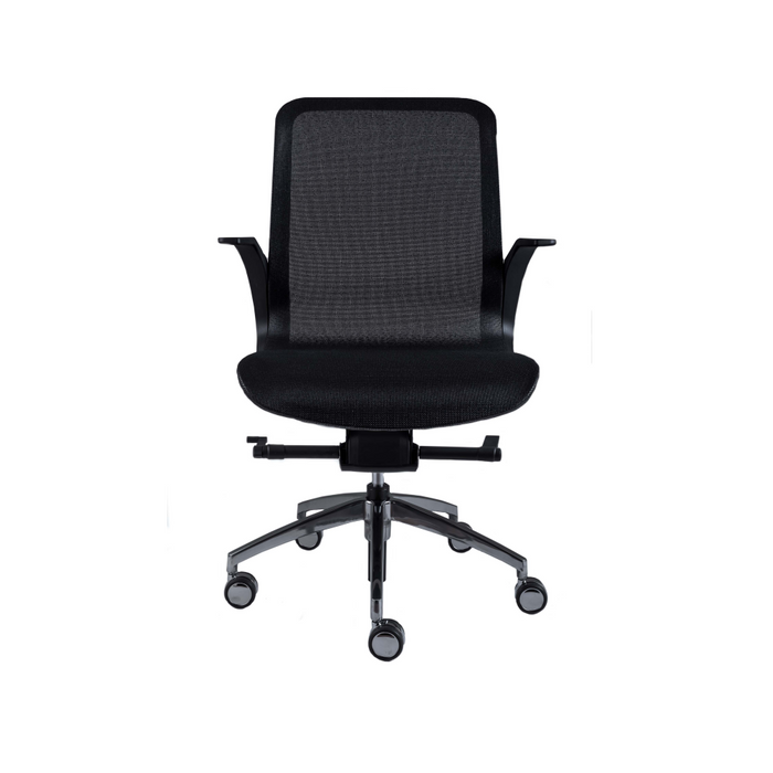 Executive chair with medium backrest, black nylon structure, open black armrests, decentrated multiblock mechanism, polished aluminum base with Ø 65 mm black wheels.