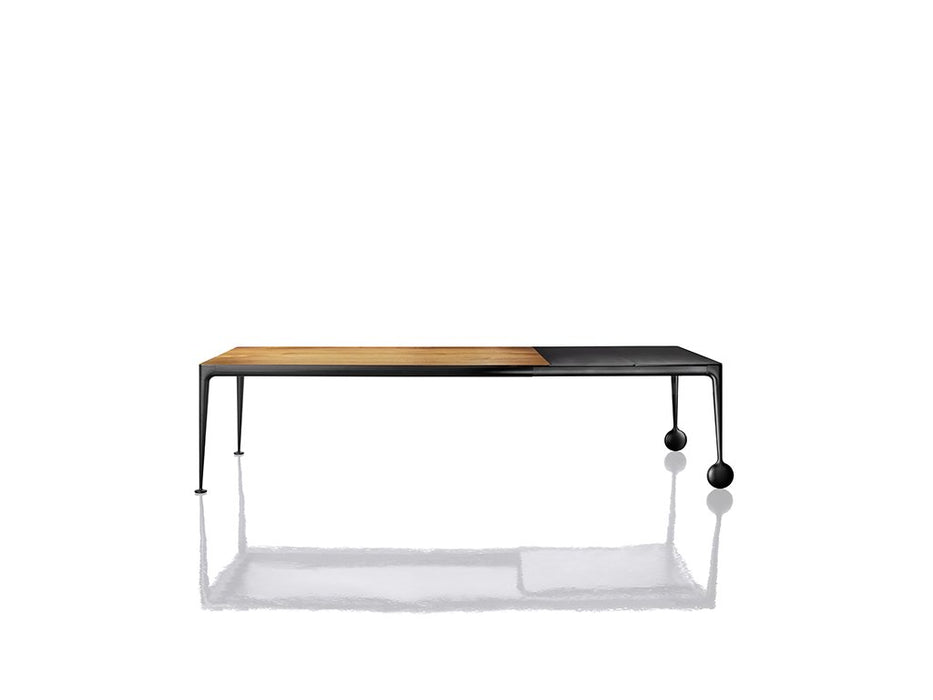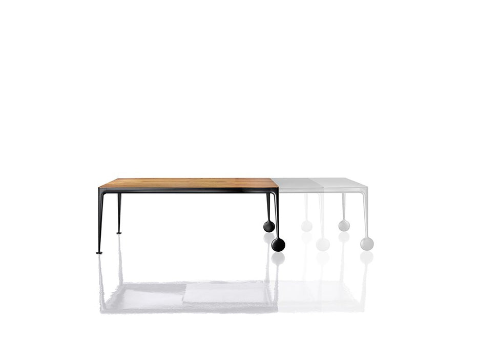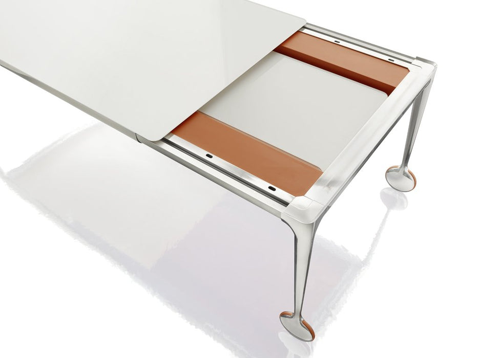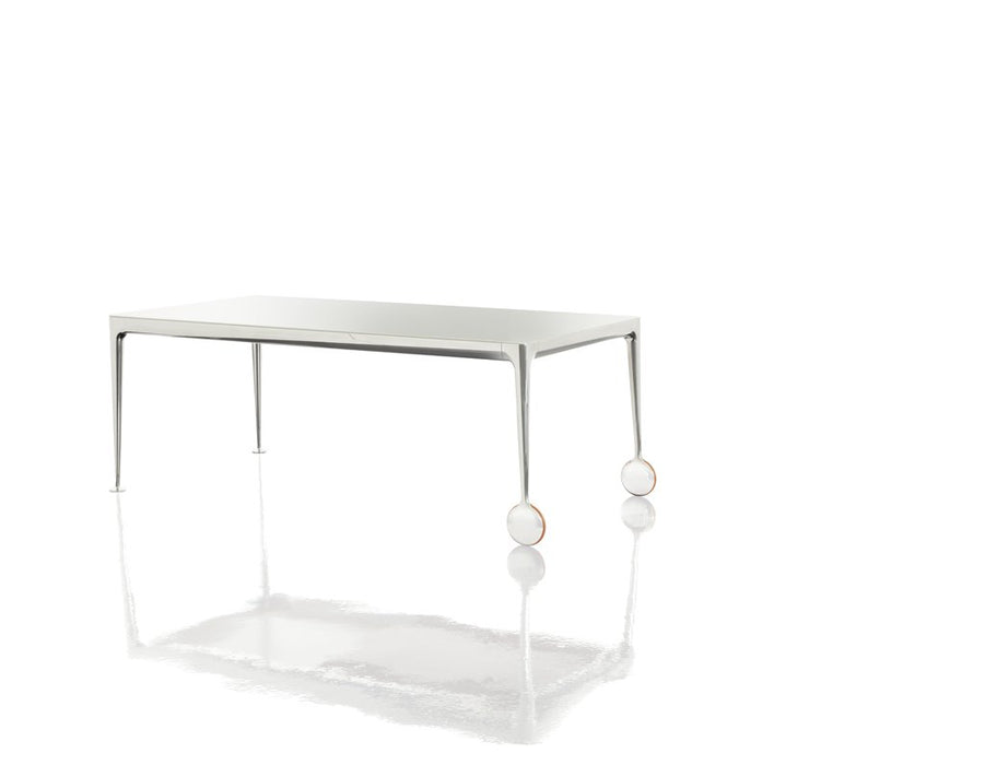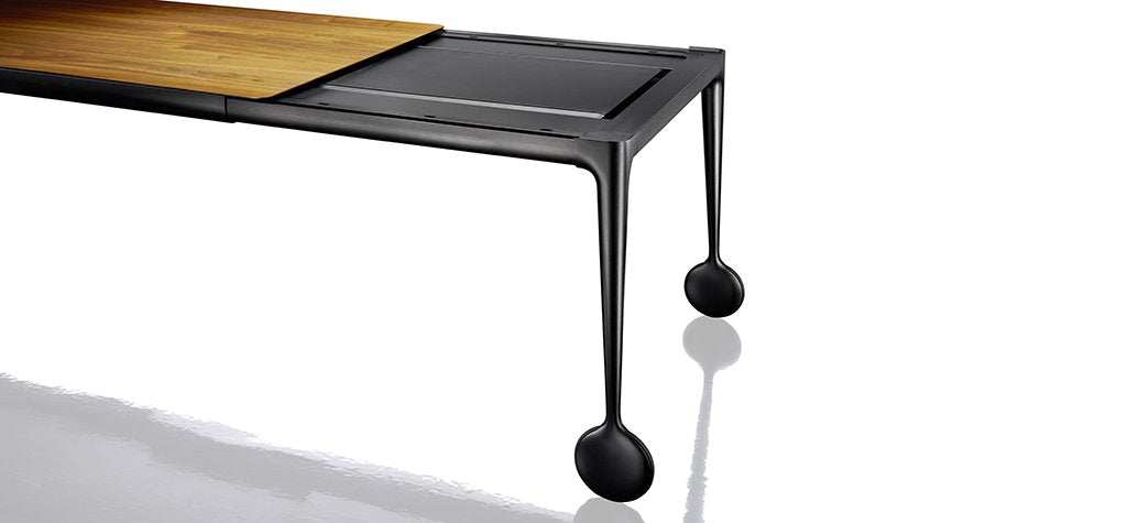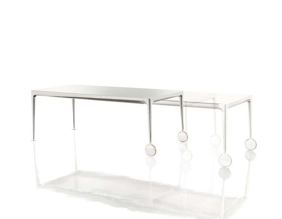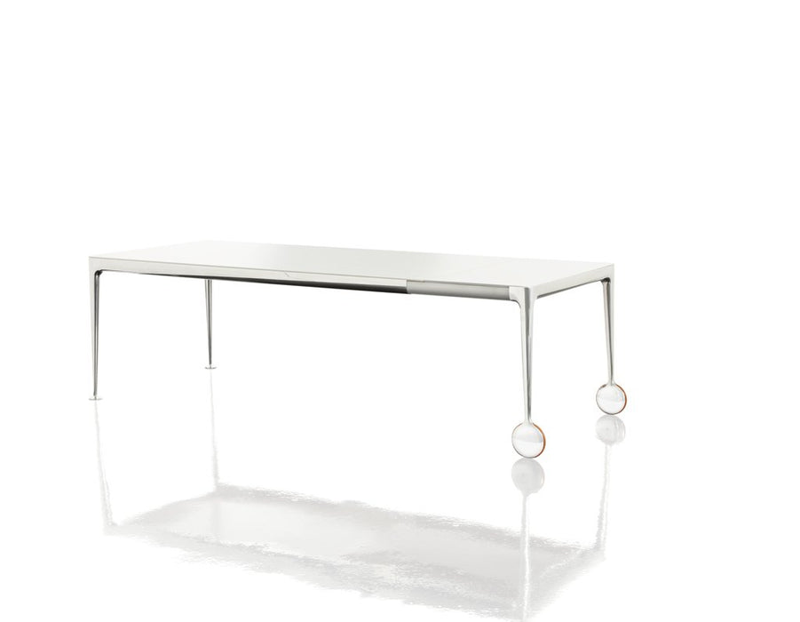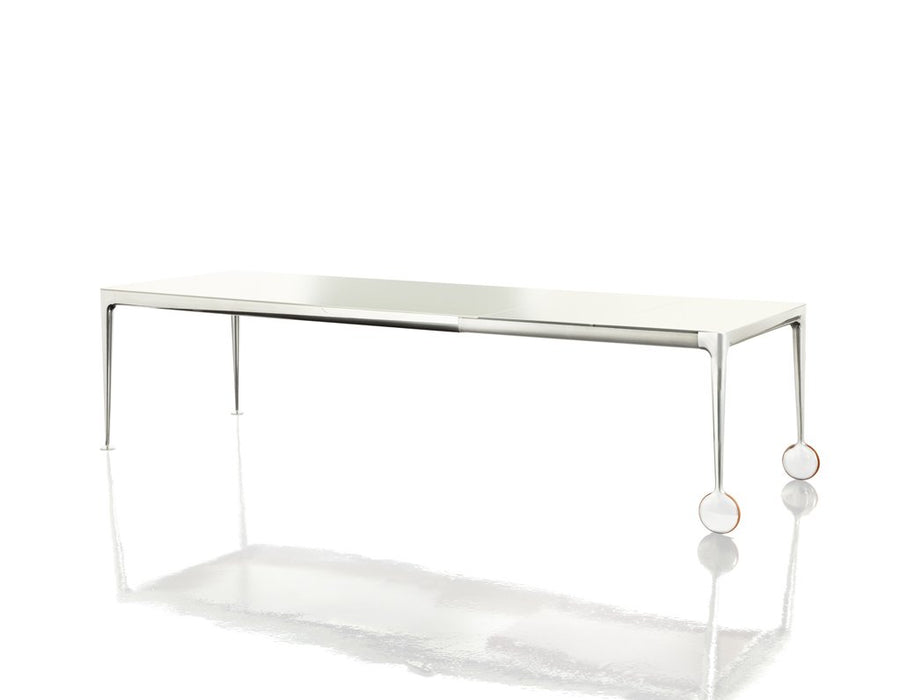 Big Will extending table marks a new chapter in a gripping story, in which the Magis philosophy and technology, with its friendly shapes and rigorous production, meets the creative spirit of Philippe Starck, design star of indisputable fame. Big Will’s most striking and characterful features are its wheels – positioned at the extending end of the table - and the die-cast aluminium structure, which comes either in a glossy finish or painted white or black. The top is in glossy or acidetched tempered glass, while the extension leaf is in glossy or matt finish MDF. It measures 200 x 100 cm closed, but with two 50-cm extension leaves, it can reach a maximum overall length of three metres. The table can be extended effortlessly, without needing to lift it, simply by gliding the extending end on the floor thanks to the two wheels, and to a patented sliding and locking mechanism developed especially for Big Will. Thus, this is an elegant, high-profile table, the fruit of several years of research to achieve that “more than” that Magis always seeks, as its very name reveals.