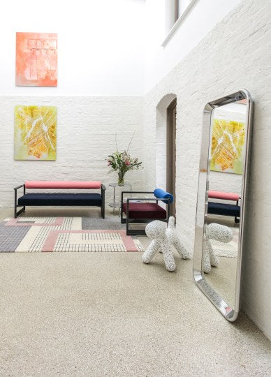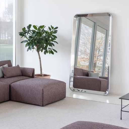 Material: Frame in extruded aluminium, polished. Joints in die-cast aluminium, polished. Mirror with protective back film. Supplied with brackets for wall hanging in zinc plated steel or resin strip for floor standing.