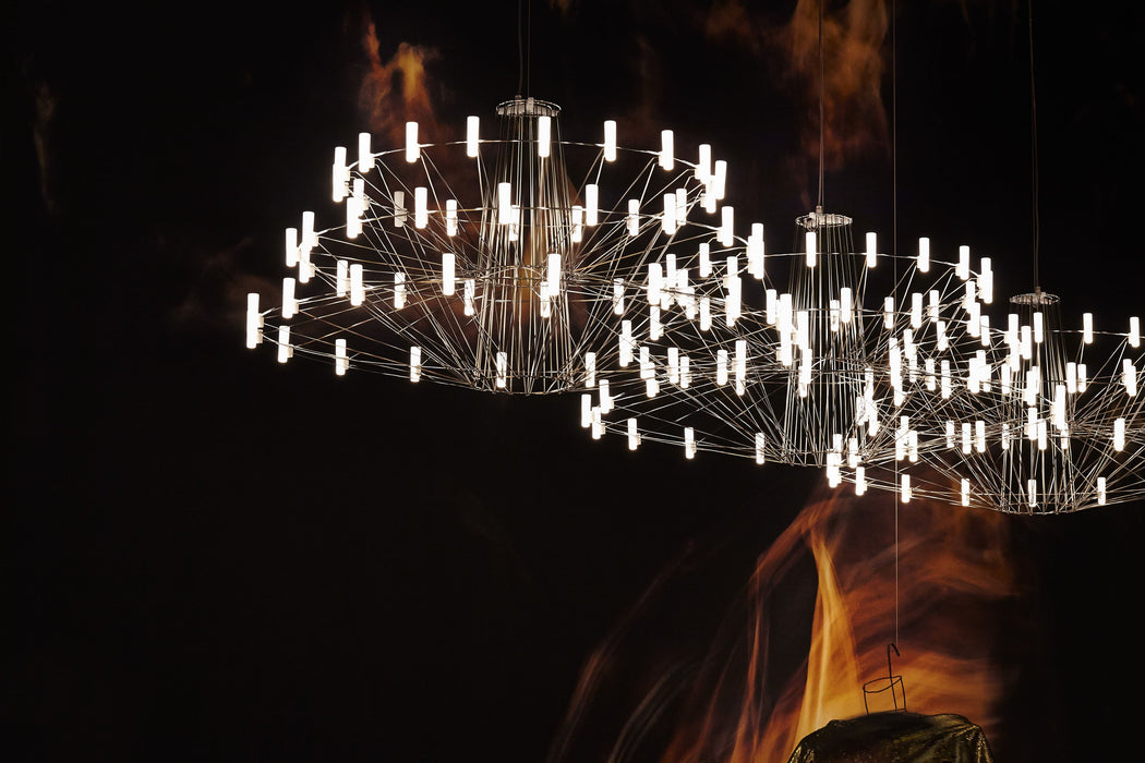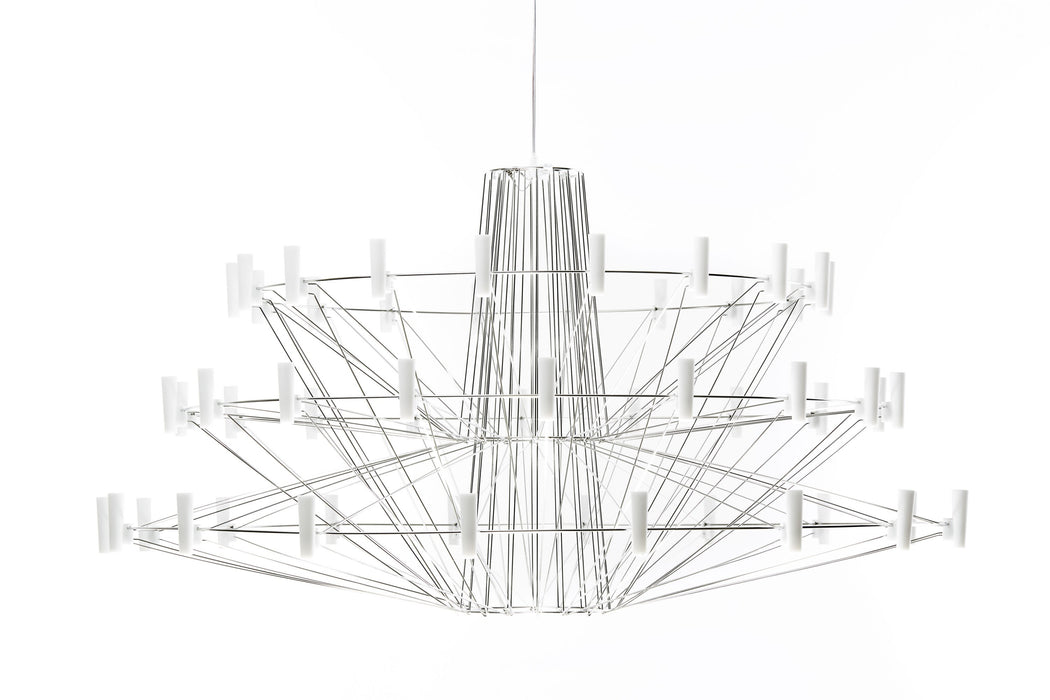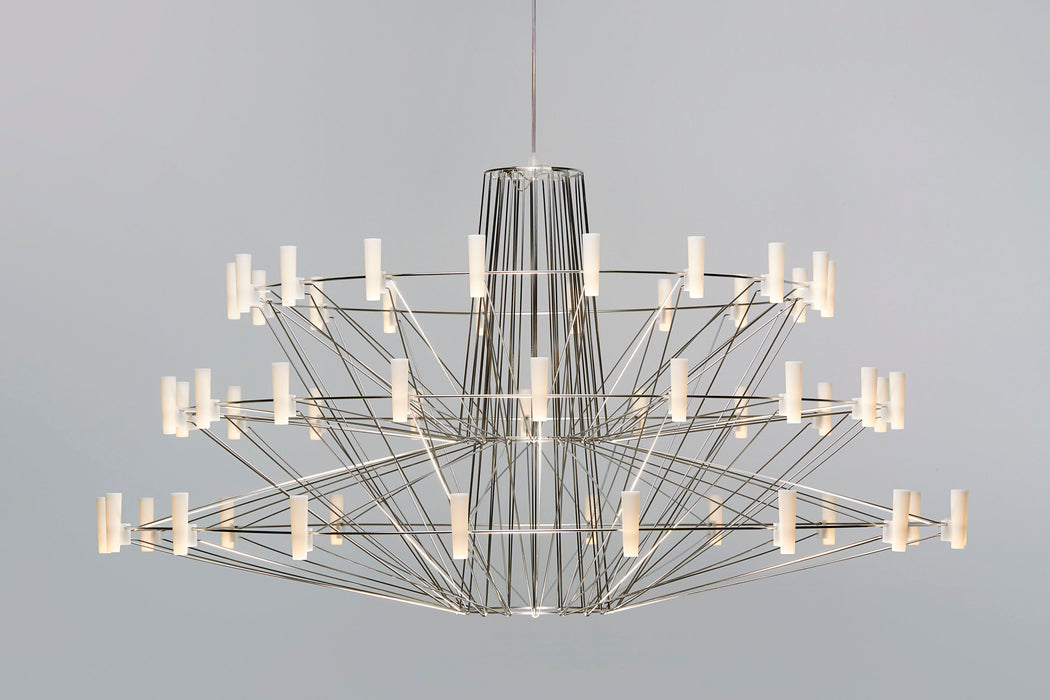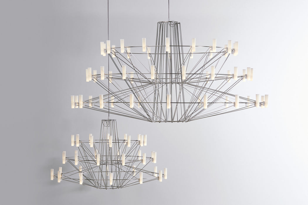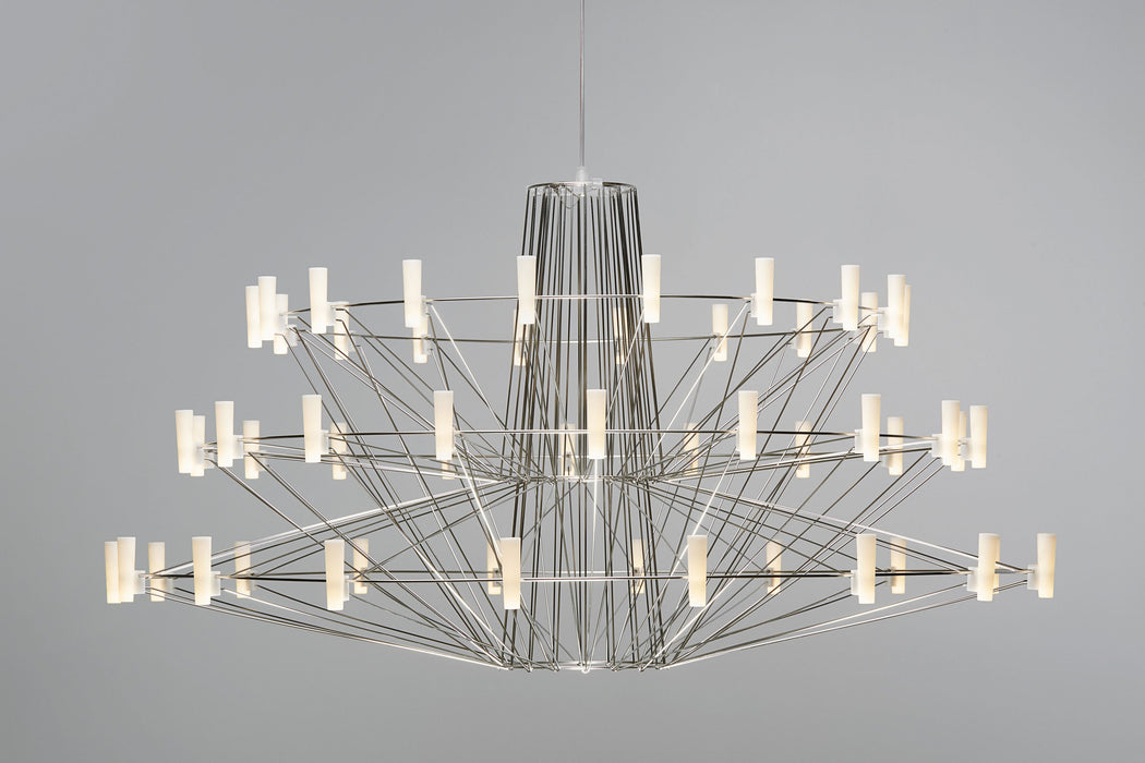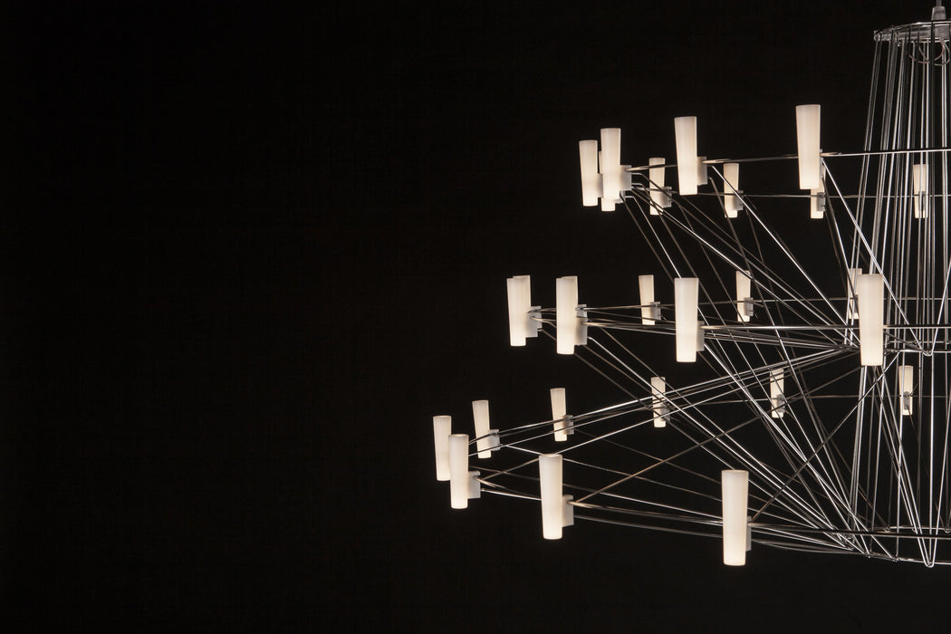 With a graceful sense of wonder, a beautiful mechanical doll appears to magically come to life in the famous ballet Coppelia. In the performance the ballerina traces, with sinuous movements, a delicate after-image in the air, which inspires the fluid motion in the design of Miyake’s Coppelia Suspended chandelier.