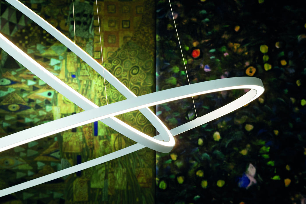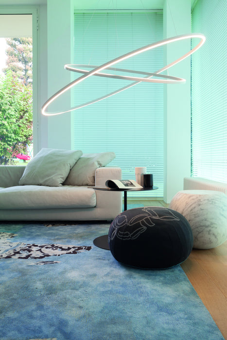 Collection of LED suspension lamps in extruded aluminum made in different versions: minor, major, double and the new "oversize" triple, mega and double mega versions, for direct or indirect diffused light. Available in different finishes, matt painted in white, black and gold, natural polished and glossy gold anodized. Opal diffuser. Ellisse is realized through a proprietary technology of coupling of the extrusions. The model "Major" is also available floor and wall versions.