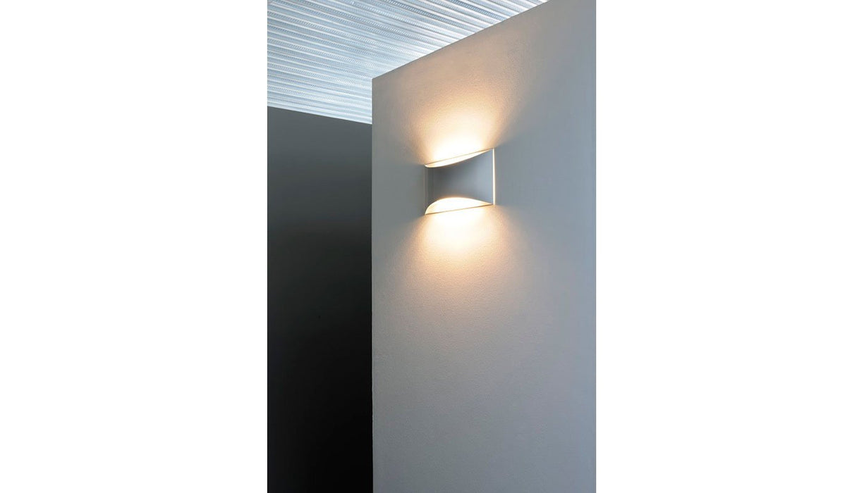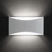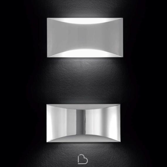 Wall lamp giving up & down light in curved laser-cut metal. White lacquered metal wall plate. White lacquered or chromium-plated metal screen.