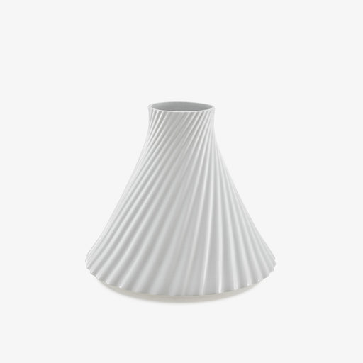 With the subtle choice of matt-finish enamelled porcelain and enlightening purity, he leads us to suggestions for other possible sources of inspiration while the vase remains unfilled : a very attractive Caribbean shell, or more artistically, the motion of the tulle tutu of Degas’ little dancer…
