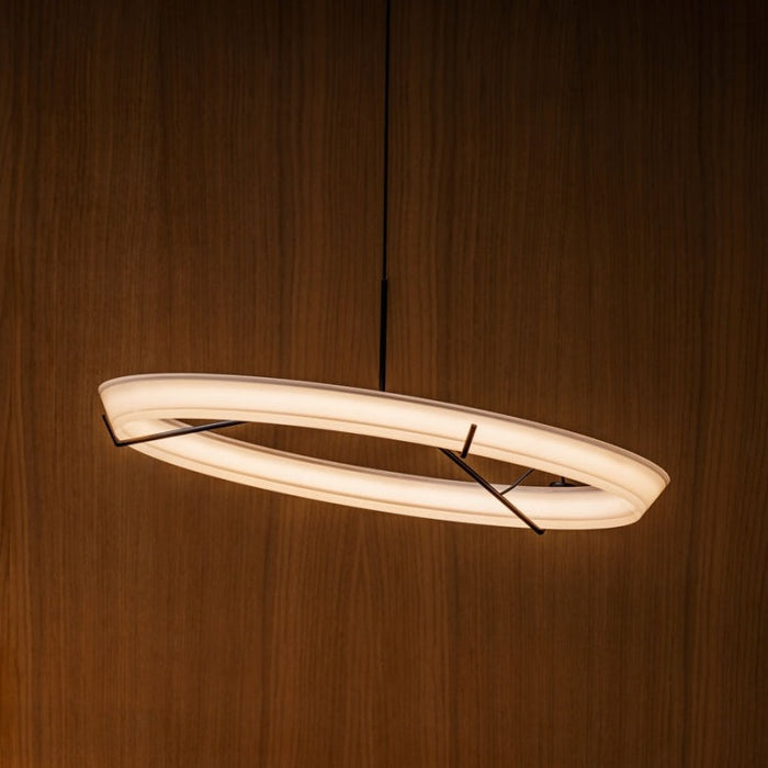 The Halo Jewel hanging lamps , configurations featuring straight and circular pieces are a Martín Azúa design. The Halo Jewel collection presents light as a precious element that is expressed in lightweight structures suspended in space.