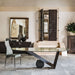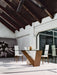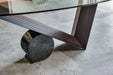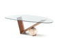 Emanuele Zenere designed the first model of the Valentino table in 1991. The product family expansion started at first with the Valentinox table and kept growing with two other omonimous console tables. The sculptural base combines volumes that seem to balance and support each other, while the glass top enlightens the different materials combination. The original design of this modern dining table, later used to conceive the Valentino wooden console table, presents a V-shaped volume made of precious wood essences, which lays on a marble cylinder. While the Valentinox console table and glass table, have a polished stainless steel V-shaped base