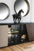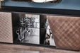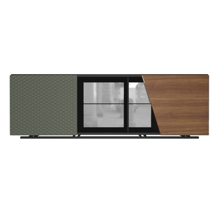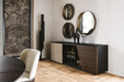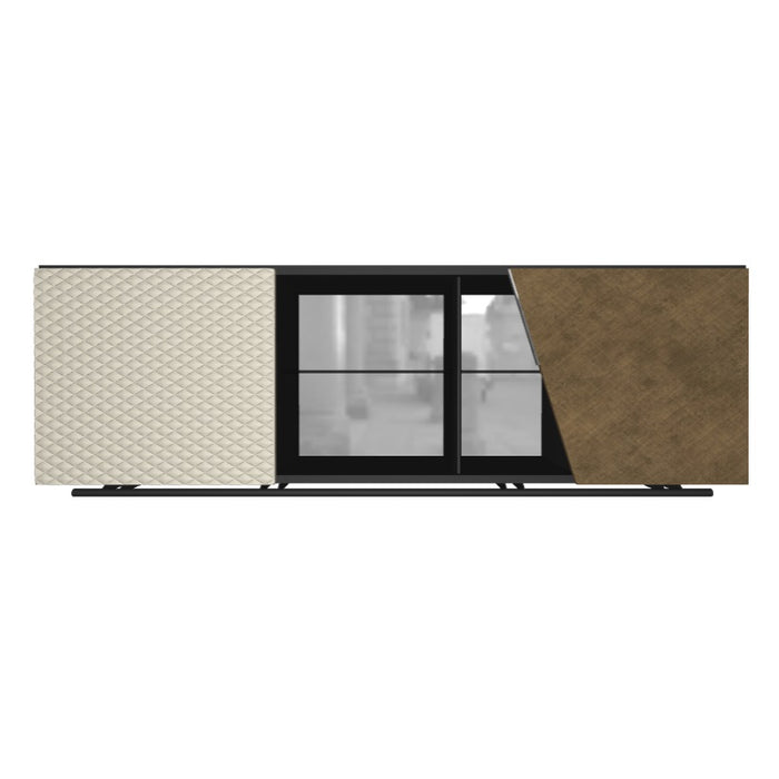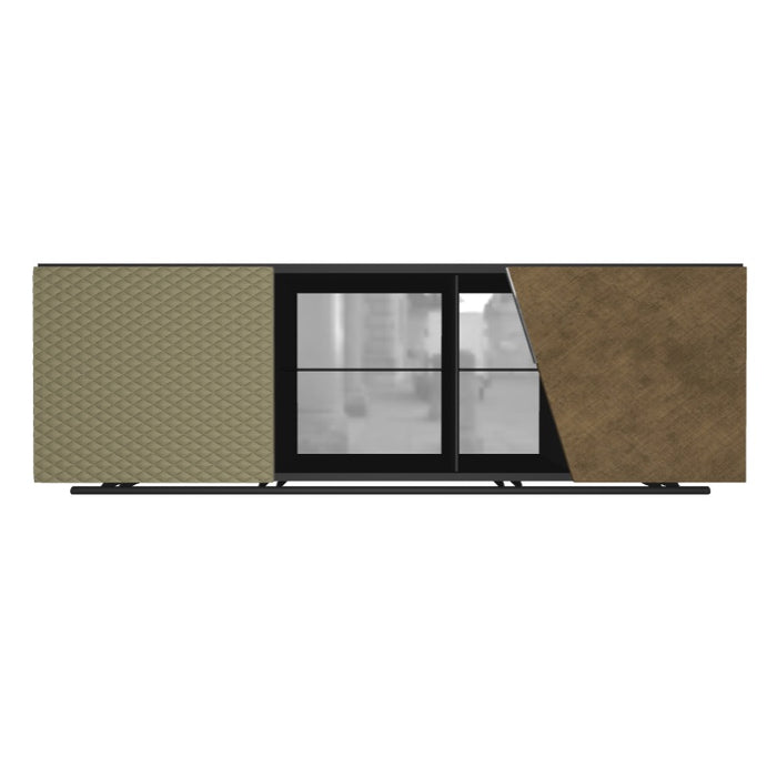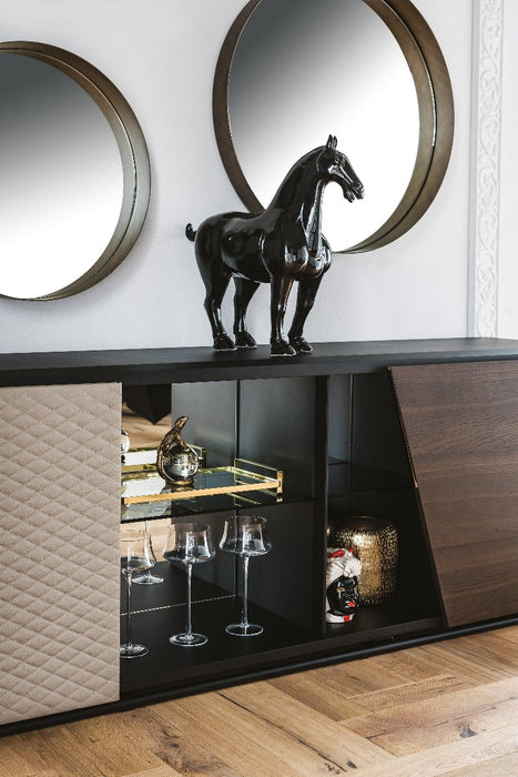 The fascinating collection of Aston furnishes consist of an amazing sideboard and a TV stand which add personality to the living room, making it unforgettable. The peculiarity of the Aston design sideboard and modern TV stand lies in the combination of a variety of materials and exquisite finishes, which give rise to a sophisticated composition that is perfectly balanced and functional at the same time. The central exposed shelves allow to further decorate the room, highlighting one's most cherished objects. This modern living room set of furniture is made up of refined materials such as wood, metal, leather and synthetic leather that are blended together seameasly thanks to a skilful craftsmanship. Thanks to their fine manufacturing and their incisive design, these products constitute a contemporary yet refined design family.