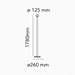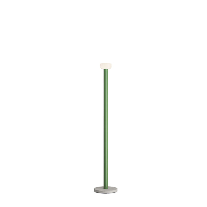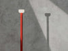 Floor lamp with indirect light. Stem in painted aluminium: shiny white, brick, cioko, green. Reflector in shiny opal white and grey blown glass. Electrical cable of 270 cm usable length with foot dimmer switch for ON/OFF function and brightness adjustment 10100%. Power supply with interchangeable plugs.