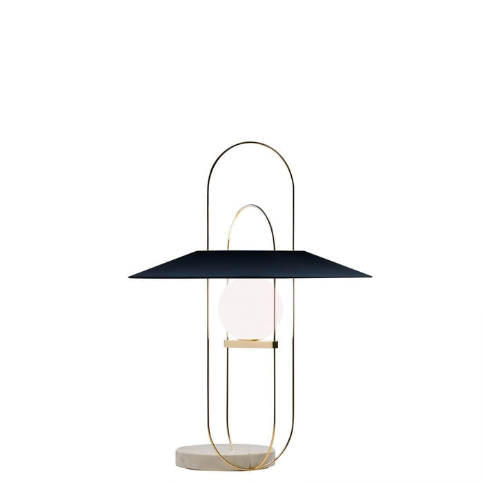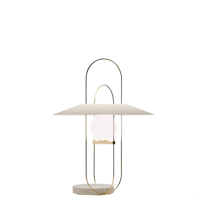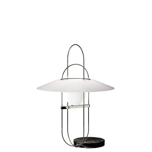 帶有漫射和可調光燈的檯燈。鍍鋅金屬框架。底座由灰色 Carnico 大理石製成。球形擴散器由乳色吹製玻璃製成,表面經過緞面處理,頂部喇叭形擴散器內部塗漆,外部經過緞面處理。黑色電源線、調光器和插頭。附可互換插頭的插入式電源(英國 - 美國 - 歐洲 - 中國)。整合led。