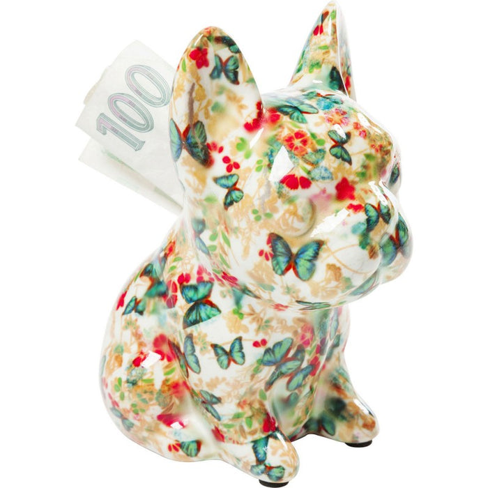 這套 4 個小鬥牛犬存錢筒由一隻藍色、一隻粉紅色、一隻白色和一隻黑色的狗組成,每隻都裝飾有花朵或蝴蝶。