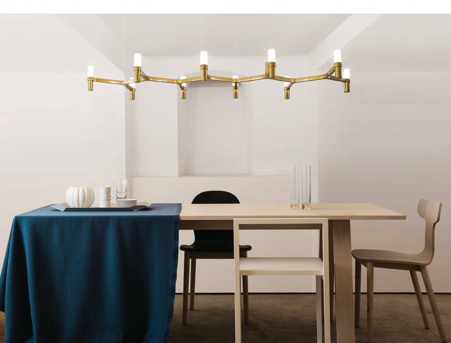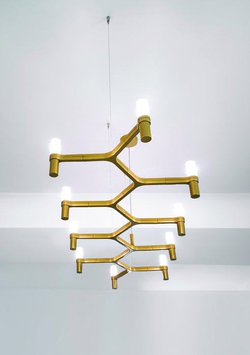吊燈採用壓鑄鋁和噴砂玻璃擴散器的模組化結構。手工拋光鋁結構,光亮鍍金或霧面白色、霧面黑色或金色塗漆。提供 NEMO LED G9 套件。廣佈光。 Summa 和 Magnum 版本的雙開關。透明電纜。應要求提供紅色電纜。