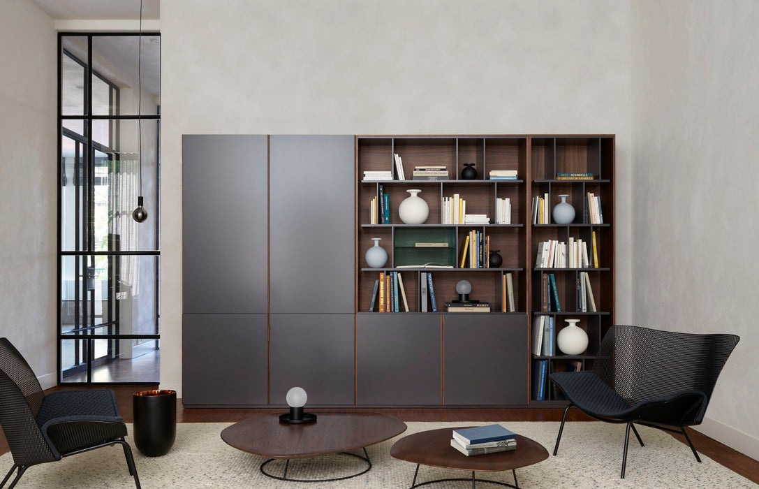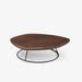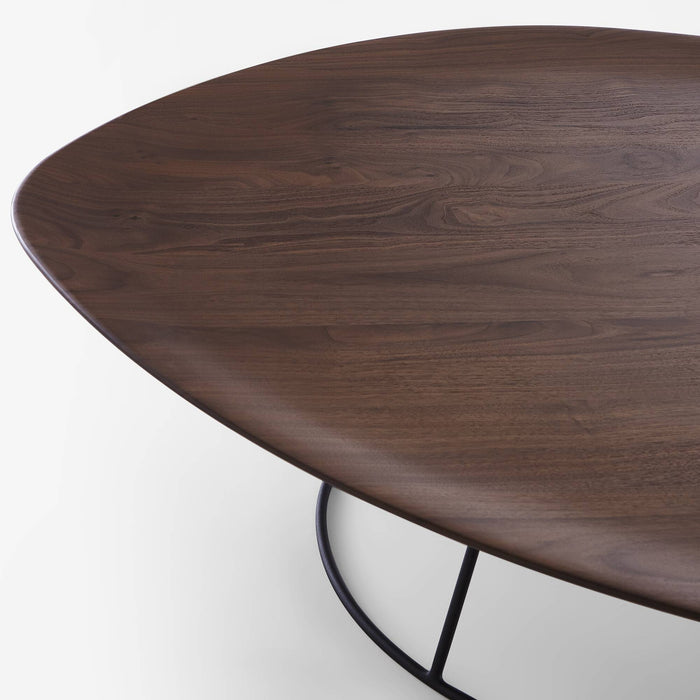 Low tables with tops in solid American walnut and bases in matt black lacquered tubular steel. These tables are sold separately, but are nonetheless designed to be used together if desired: the top of the convex table fits over the top of the concave table.